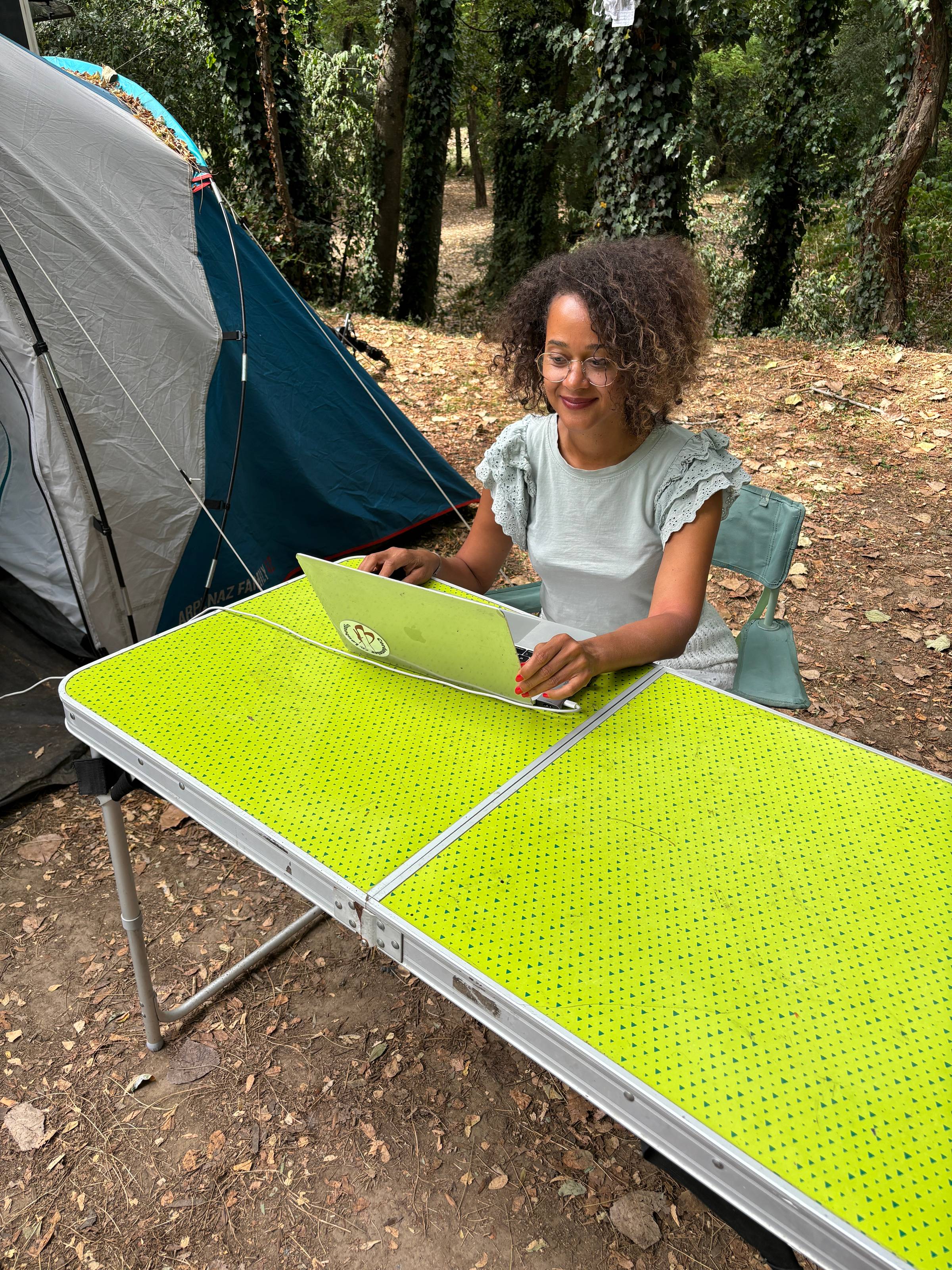 Bonus coulisses : petite photo de moi en train de travailler sur ma page de vente… depuis le camping.(Parce que mon mec est fan de tente pour les vacances d'été. Moi, un peu moins 😅)